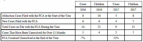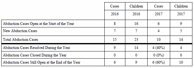 Voluntary Resolution: The Convention states that central authorities “shall take all appropriate measures to secure the voluntary return of the child or to bring about an amicable resolution of the issues.” In 2017, four abduction cases were resolved through voluntary means.