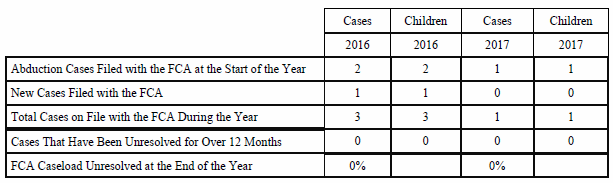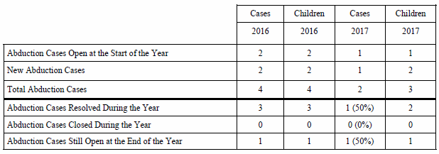 Voluntary Resolution: The Convention states that central authorities “shall take all appropriate measures to secure the voluntary return of the child or to bring about an amicable resolution of the issues.” In 2017, one abduction case was resolved through voluntary means.
