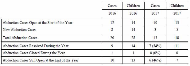 Voluntary Resolution: The Convention states that central authorities “shall take all appropriate measures to secure the voluntary return of the child or to bring about an amicable resolution of the issues.” In 2017, two abduction cases were resolved through voluntary means.