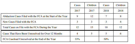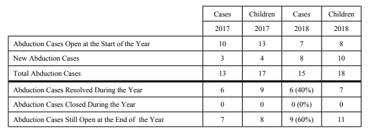 Voluntary Resolution: The Convention states that central authorities “shall take all appropriate measures to secure the voluntary return of the child or to bring about an amicable resolution of the issues.” In 2018, two abduction cases were resolved through voluntary means.