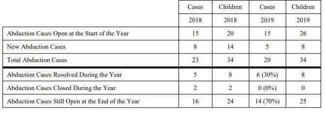 Initial Inquiries: In 2019, the Department received one initial inquiry from a parent regarding a possible abduction to Egypt for which no additional assistance was requested or necessary documentation was not received as of December 31, 2019.