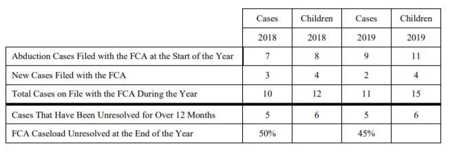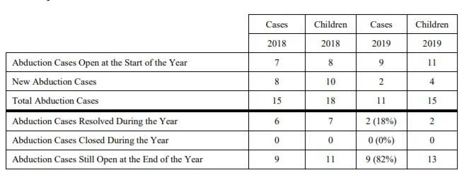 Voluntary Resolution: The Convention states that central authorities “shall take all appropriate measures to secure the voluntary return of the child or to bring about an amicable resolution of the issues.” In 2019, one abduction case was resolved through voluntary means.