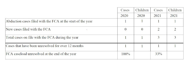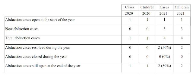 Voluntary Resolution: The Convention states that central authorities “shall take all appropriate measures to secure the voluntary return of the child or to bring about an amicable resolution of the issues.” In 2021, one abduction case was resolved through voluntary means.